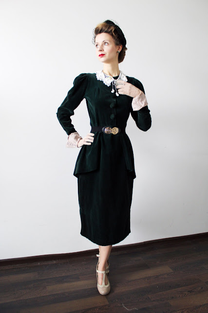 Z jakiś powodów współczesne retro marki bardzo lat trzydziestych nie lubią. A przecież dekada ta oferuje tak wiele bajecznych krojów, które byłyby chętnie noszone przez osoby takie jak ja: kompletnie zmęczone kolejnymi takimi samymi rozkloszowanymi sukienkami stylizowanymi na amerykańskie gospodynie domowe, czy kopiami sukienek brytyjskich landgirls z lat wojennych. Pozostało ratować się oryginałami, które niestety niezbyt lubią się z moją sylwetką (czyt. są na mnie za duże ;_;). Mimo tego zdecydowałam się jednak kupić szmaragdowy cud z aksamitu. Ponownie otrzymałam bardzo duży rabat (30 euro), więc grzechem byłoby nie skorzystać. No i bam. No i mam co chciałam.